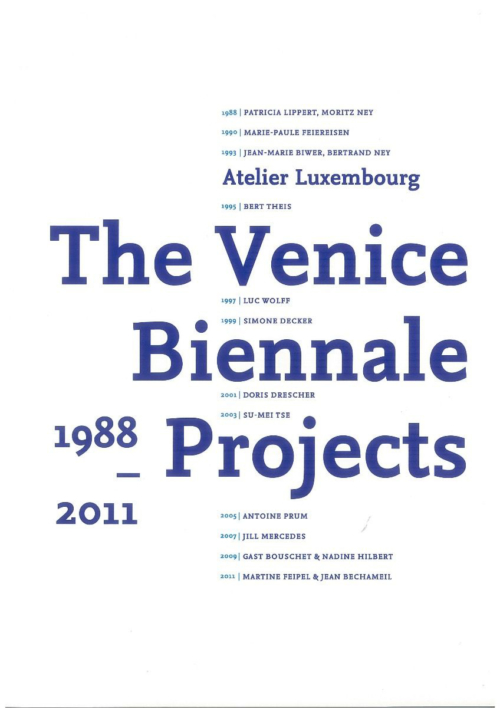 Atelier Luxembourg - The Venice Biennale Projects 1988-2011zeichnet den außergewöhnlichen Weg nach, den das kleine Land Luxemburg mit seinen Teilnahmen an der internationalen Ausstellung für zeitgenössische Kunst in Venedig gegangen ist. Für die Ausstellung wurden die künstlerischen Projekte mit Originalwerken so weit wie möglich formal so rekonstruiert, wie sie seinerzeit in Venedig gezeigt wurden - mit gewissen für ihre Präsentation im musealen Rahmen notwendigen Anpassungen. Vorgestellt werden die Projekte von Patricia Lippert und Moritz Ney (1988), Marie-Paule Feiereisen (1990), Jean-Marie Biwer und Bertrand Ney (1993), der Pavillon Potemkin Lock von Bert Theis (1995), eine Neuinterpretation der Installation Magazzino von Luc Wolff (1997), Chewing and Folding in Venicevon Simone Decker (1999), die Installation Casa Mia von Doris Drescher (2001), die Ausstellung Air Conditioned von Su-Mei Tse (2003), Mondo Veneziano ein Film von Antoine Prum (2005), die Video-Installation Collision Zone von Gast Bouschet und Nadine Hilbert (2009) und die Installation Le Cercle fermé von Martine Feipel und Jean Bechameil (2011).
