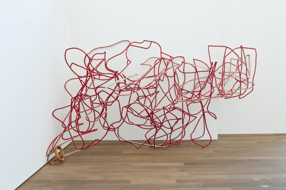 Auf gewisse Weise finden sich diese Elemente auch im Werk von Claire Barclay wieder. Das erstmals 2009 in der West-Galerie auf der ersten Etage gezeigte Pale Heights ist eine Komposition aus skulpturalen Formen und Stoffen. Vertraute Materialien wie Leder, Kupfer oder Wolle, die gleichzeitig andeuten, aber ohne direkte Bezüge sind, gehen eine einzigartige Beziehung mit dem Raum ein und verleihen dem Werk einen Abstraktionsgrad, der umso größere erzählerische Qualitäten hat.