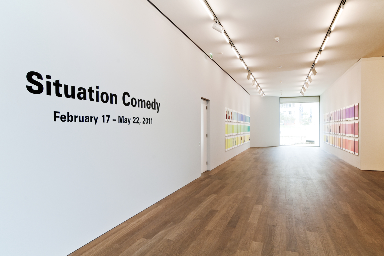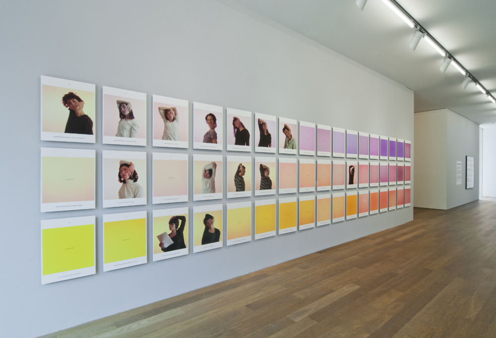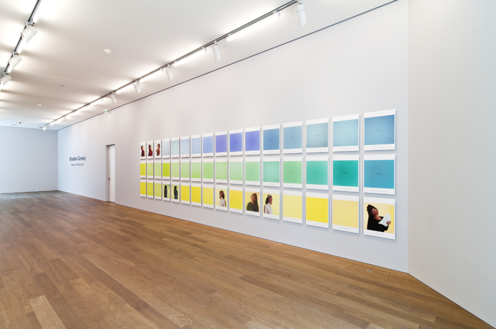 Suzanne Lafont unternimmt indessen in Situation Comedy noch eine weitere Verschiebung, bei der die Bedeutung des Theaterhaften wiederum in Frage gestellt wird: sie zielt auf die Kraft der Sprache, genauer gesagt auf die der Namen, um die Leere zu reaktivieren, die durch die abwesenden Darsteller entstanden ist. Jeder Abzug zeigt nämlich außer der in der Broschüre angegebenen entsprechenden Seitennummer auch die Namen der Studenten sowie diejenigen der ursprünglichen Akteure, deren Haltung er oder sie jeweils übernommen hat. Die Tatsache, dass auch die leeren Bilder die Namen der beiden Gruppen enthalten, weist auf die zentrale Rolle der Namen in Suzanne Lafonts Installation hin.