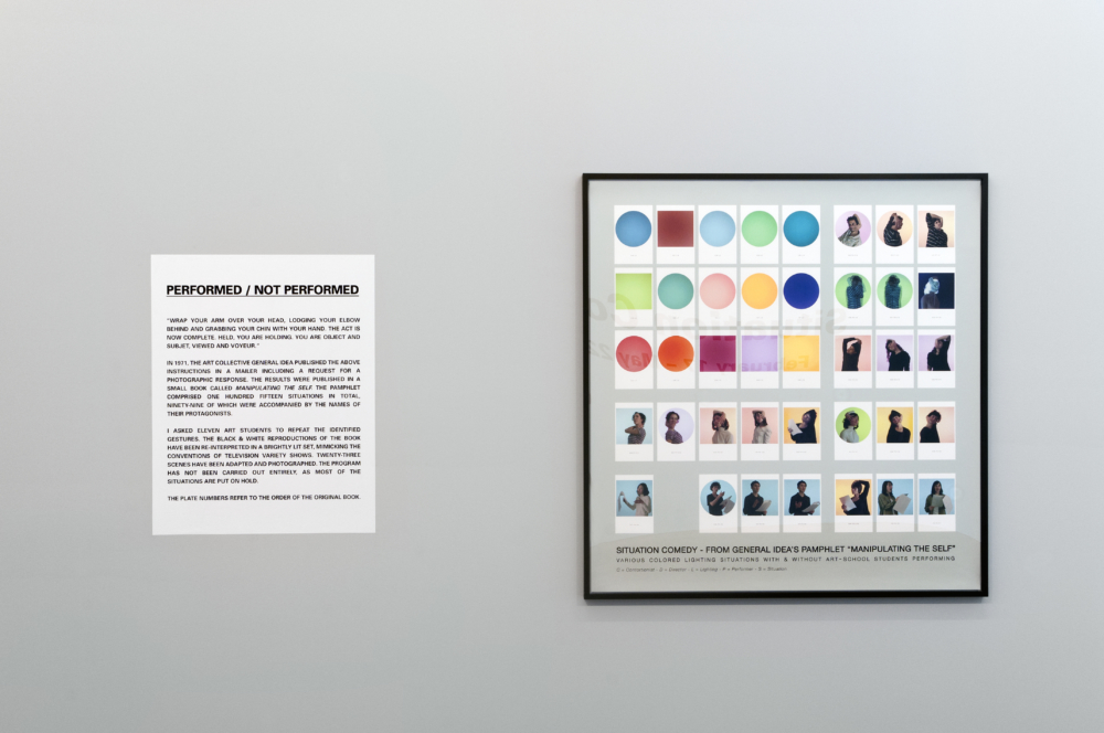 Mit Situation Comedy beleuchtet Suzanne Lafont diesen Übergang von der „Selbstmanipulation” zur „Bühnenmanipulation” neu, indem sie eine Reihe von Verlagerungen vornimmt. Dabei eignet sie sich Manipulating the Self an, indem sie sich zunächst für die Spannung zwischen dem Spiegelbildlichen und dem Spektakulären interessiert. Während das Projekt von General Idea mit der Idee der Hand als „Spiegel des Geistes” spielte, ist Situation Comedy hingegen ist eine Art Inszenierung von Manipulating the Self, das so in die Welt des Theaterhaften transponiert wird, wobei das Ich nur noch eine Nebenrolle spielt. Die 99 Drucke in Situation Comedy übernehmen die 99 in der Broschüre von General Idea mit Namen versehenen Fotografien. Bei 23 Abzügen wurden die ursprünglichen Haltungen von einer Gruppe von Kunststudenten, mit denen die Künstlerin an diesem Projekt gearbeitet hatte, nachgestellt. Die restlichen 76 Bilder hingegen sind leer: es sind einfarbige Bildhintergründe ohne Personen, die nur mit „(not performed)” [„(nicht dargestellt)”] beschriftet sind, womit sie die symmetrische, in den ursprünglichen Fotografien zwischen „Objekt und Subjekt, Betrachtetem und Betrachter” bestehende Beziehung aufheben.