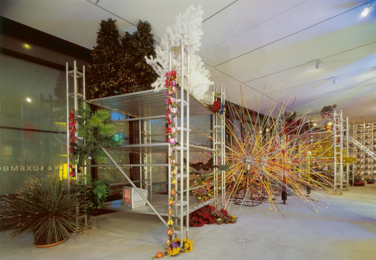 John M Armleder Mondo-Tiki Radiolaria, 2005 Échafaudage, bois, plantes et arbres artificiels, téléviseurs, radio-cassettes, luminaires