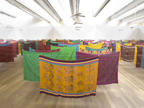 In A Mirror Woman, (2002) einem durch beidseitige Spiegel ins unendliche erweiterten Gang, verwendet die koreanische Aktions- und Installationskünstlerin Kimsooja (1957) mit den zahlreichen, den Raum verhängenden bunten Tüchern ein typisches Element ihrer Heimat, das weit mehr als nur dekorativ ist. Das Ybulbo dient als Tagesdecke im koreanischen Alltag als Ort der Ruhe, der Liebe, gar des Sterbens und wird darüber hinaus oft als Bündel zum Transport von Kleidern und Büchern oder gar als Leichendecke verwendet. Zentraler Bestandteil von Kimsoojas künstlerischer Arbeit seit einigen Jahren, symbolisiert es darüber hinaus die weibliche Seite und auch das Nomadenhafte, nicht zuletzt in der Existenz der Künstlerin selbst. Die Sinnlichkeit und Leichtigkeit der Installation fordert den Betrachter zudem geradezu zur aktiven „Entdeckung”. des Raumes heraus.