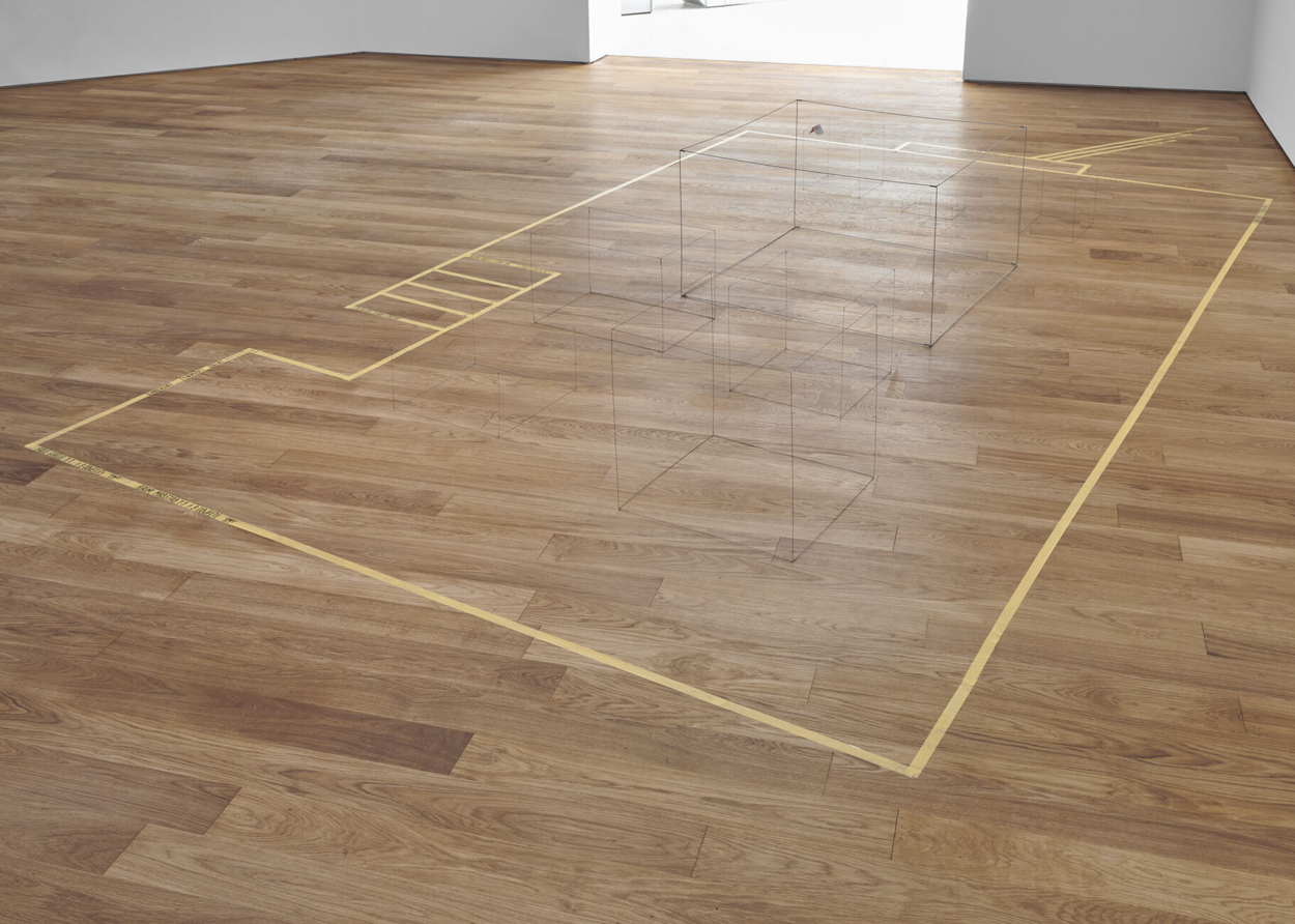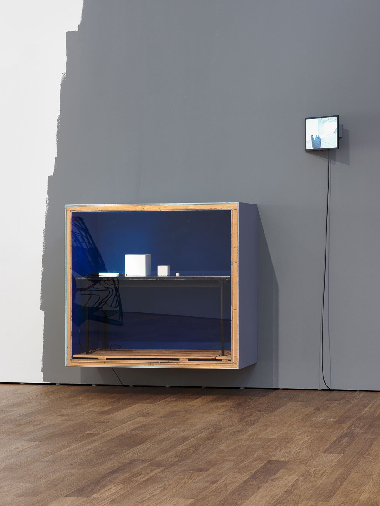 Joëlle Tuerlinckx (1958, Bruxelles) développe une approche de l’espace qui se caractérise par l’emploi de matériaux légers, instables, propices aux réagencements. Ses sculptures sont indissociables de leur lieu d’exposition et posent la question du rapport au contexte. TOUT CE QUI N’EST / ALLES WAT NIET IS / ALL THAT IS NOT + 9 objets ‘1M3’ (2012) a été initialement présentée – et alors acquise par Gaby et Wilhelm Schürmann – dans une petite salle dont les murs sont ici représentés au sol à une échelle légèrement réduite. L’œuvre est composée de neuf formes géométriques qui, dans le lexique personnel de l’artiste, se définissent comme des « objets » ou « volumes d’air ». Ces volumes se matérialisent uniquement par leurs arrêtes en fil de fer. L’artiste les considère comme des boîtes dont les fines ossatures sont presque invisibles, seul l’éclairage projette leur ombre sur le sol. Leur contenu, pourtant impalpable, acquiert dès lors une densité particulière et attire l’attention sur l’espace environnant. L’air et la lumière deviennent des matériaux à part entière. De fait, dans la pratique de Tuerlinckx, tout est matière, des éléments atmosphériques à la collecte d’éléments les plus divers, rassemblés dans l’atelier. Celui-ci devient autant le lieu de la création que celui de l’inventaire. Poche d'atelier (période bleue, avec table et 3 cubes (2008)) (2011) constitue un instantané de la vie qui s’y déroule. À la manière d’un diorama, une grande vitrine murale en offre un fragment. La composition à échelle réelle encapsule la disposition originale des objets posés sur la table. Le mur peint en gris ouvre un autre espace au sein même de la galerie. Les deux œuvres, en mêlant plusieurs lieux d’exposition, créent des liens entre différentes temporalités, le passé et le temps de la création reliés au présent et l’instant de l’exposition.