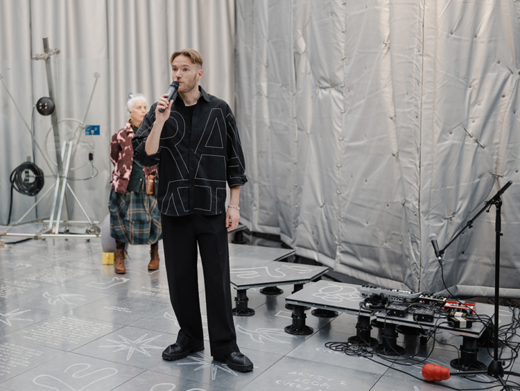 Créée à l’origine pour le Pavillon luxembourgeois de la 60e Exposition internationale d’art – La Biennale di Venezia (2024), l’installation A Comparative Dialogue Act est le fruit d’une collaboration inédite entre l’artiste et musicien luxembourgeois Andrea Mancini (1989, Luxembourg) et le collectif pluridisciplinaire Every Island, fondé à Bruxelles en 2021. À la croisée de l’art visuel, de la performance et de la musique, l’œuvre conçoit le lieu d’exposition comme un espace de production et d’expérimentation avec d’autres artistes, élargissant ainsi la notion d’œuvre collective. Le son et l’espace entrent en résonance : les éléments spatiaux – sol et murs – sont transformés en dispositifs sonores, façonnant progressivement une expérience immersive et collective. Le titre de l’exposition résume la nature de ce projet expérimental : une exploration de différents langages sonores et musicaux qui envisage le potentiel du son comme outil de négociation, d’intervention et de contamination.