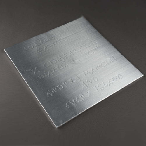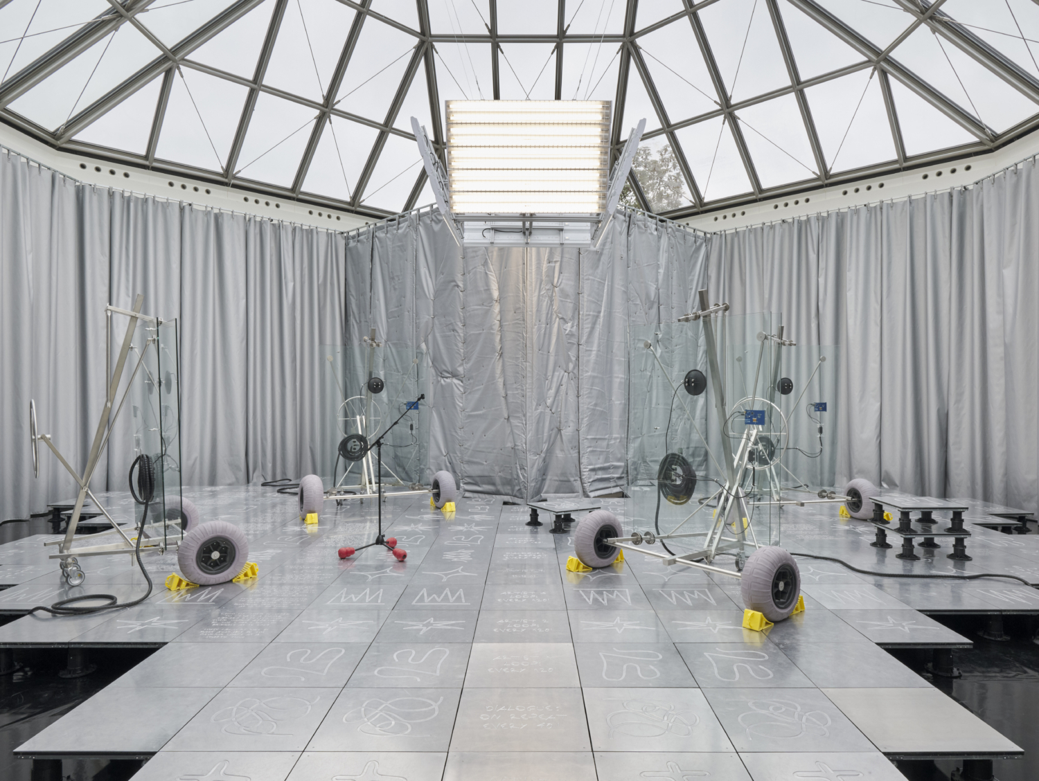 Créé initialement pour le pavillon luxembourgeois de la 60e Biennale di Venezia en 2024, A Comparative Dialogue Act est né de la collaboration entre l’artiste et musicien Andrea Mancini (*1989, Luxembourg) et le collectif pluridisciplinaire Every Island (fondé en 2021 à Bruxelles). Au croisement de l’art visuel, de la performance et de la musique, l’exposition se déploie comme un terrain d’expérimentation où les artistes en résidence conçoivent de nouvelles pièces performatives à partir d’une bibliothèque sonore partagée. Ici, espace et son fusionnent : le sol et les panneaux de verre montés sur roulettes agissent comme des haut-parleurs, tandis que la réverbération de l’architecture et des objets transforme le lieu en un vaste système de sonorisation aux lignes épurées, propice à une expérience immersive.